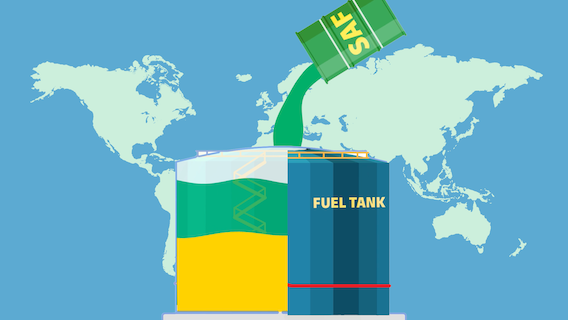 We use Sustainable Aviation Fuel made from recycled waste, like used cooking oil or other renewable resources, that is specifically designed to be a substitute for traditional jet fuel.